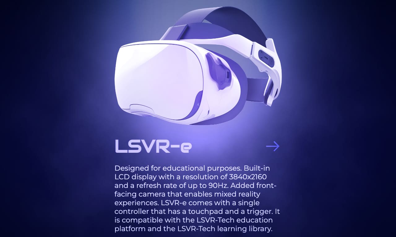 Designed for educational purposes. Built-in LCD display with a resolution of 3840×2160 and a refresh rate of up to 90Hz. Added front-facing camera that enables mixed reality experiences. LSVR-e comes with a single controller that has a touchpad and a trigger. It is compatible with the LSVR-Tech education platform and the LSVR-Tech learning library.LSVR-e