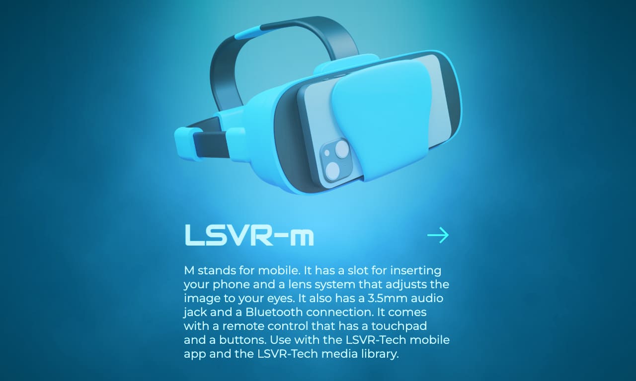 M stands for mobile. It has a slot for inserting your phone and a lens system that adjusts the image to your eyes. It also has a 3.5mm audio jack and a Bluetooth connection. It comes with a remote control that has a touchpad and a buttons. Use with the LSVR-Tech mobile app and the LSVR-Tech media library.LSVR-m