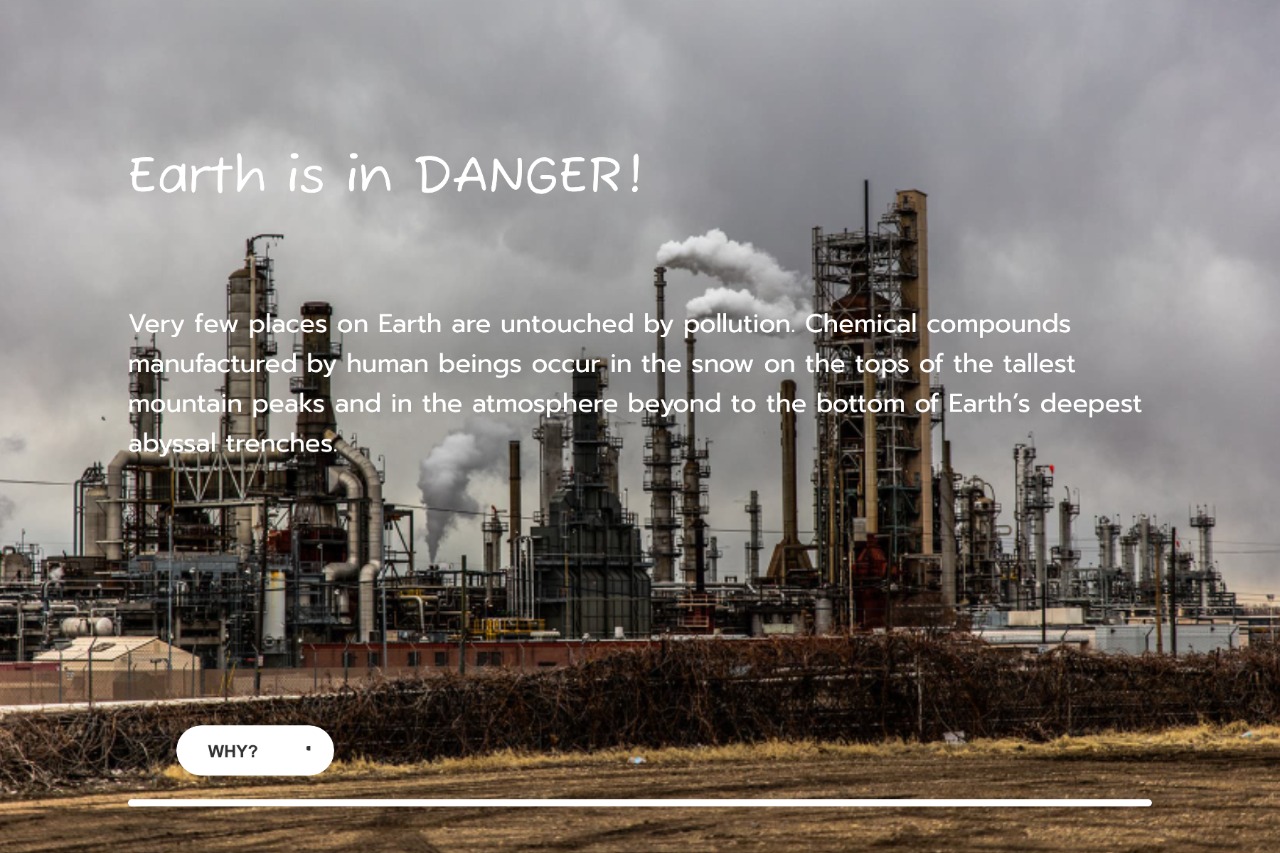 Why?Very few places on Earth are untouched by pollution. Chemical compounds manufactured by human beings occur in the snow on the tops of the tallest mountain peaks and in the atmosphere beyond to the bottom of Earth’s deepest abyssal trenches.Very few places on Earth are untouched by pollution. Chemical compounds manufactured by human beings occur in the snow on the tops of the tallest mountain peaks and in the atmosphere beyond to the bottom of Earth’s deepest abyssal trenches.Earth is in DANGER!Earth is in DANGER!